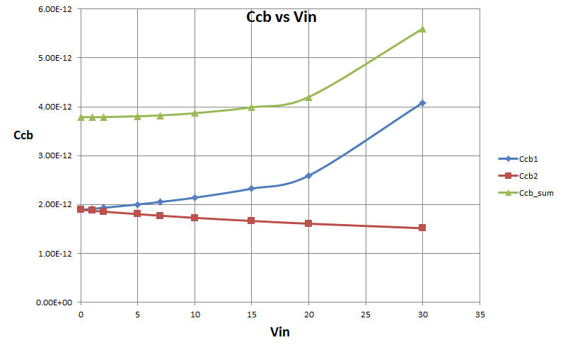 Attached Excel spreadsheet demonstrates this capacitance change in case of topology 1 (schematic 1) while input voltage is changing from 0 to 30 volts. It is also shown in the following picture as Ccb_sum.