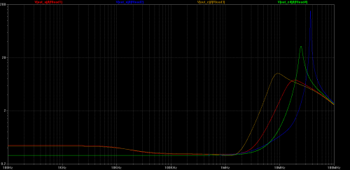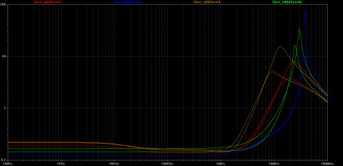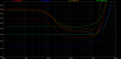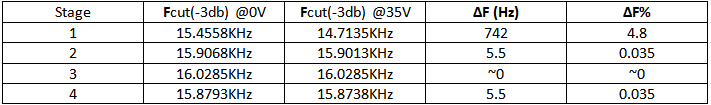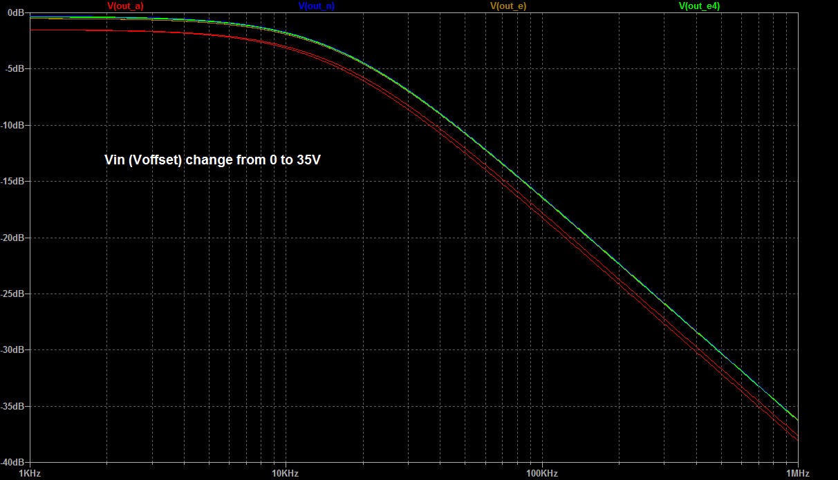 Let’s evaluate cutoff frequency change for all versions of output stages while input signal (offset) changes from 0V to 35V.