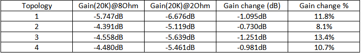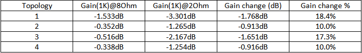 Next set of tests is related to change of small signal transfer function, while driving different loads. Two loads, 8 Ohm and 2 Ohm were selected. While 2 Ohms may seem to be extremely low, many 4 Ohm loudspeakers may have impedance, close to 2 Ohm at some frequencies. The other reason is to emphasize potential problems (if any), common to particular topology.