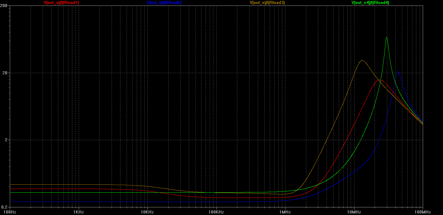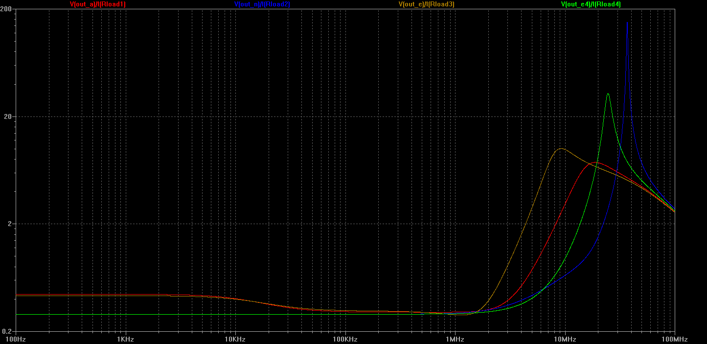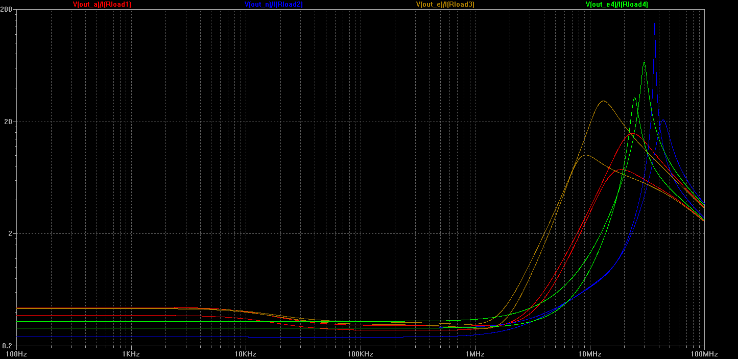 Results of previous tests show importance of output impedance evaluation. Small signal AC voltage source was inserted between load and ground to inject test signal. Output impedance was evaluated as ratio between voltage at the output and current in the load, while making AC sweep of added voltage source.